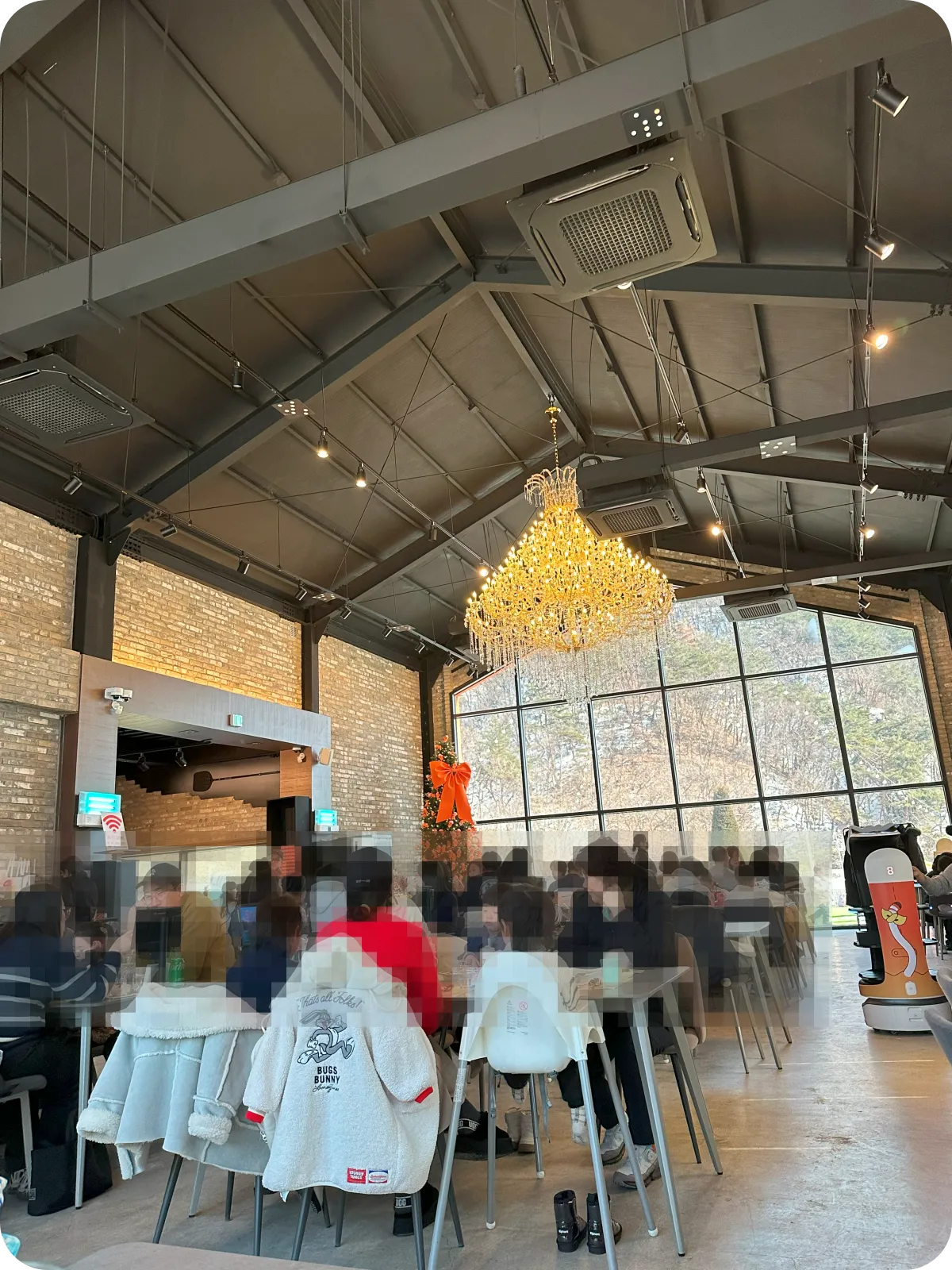 - 개방감: 천장이 높고 양쪽이 통유리로 되어 있어 개방감이 뛰어납니다. 커다란 샹들리에가 있어 고급스러운 느낌도 줍니다.